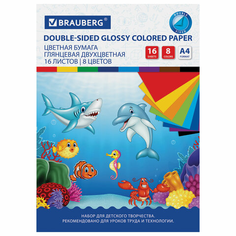 Цветная бумага А4 2-сторонняя мелованная (глянцевая), 16 листов 8 цветов, на скобе, BRAUBERG, 200х280 мм, "Морская", 129924