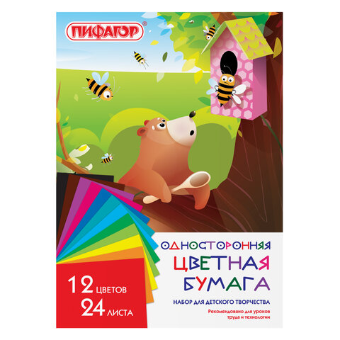 Цветная бумага А4 газетная, 24 листа, 12 цветов, на скобе, ПИФАГОР, 200х280 мм, "Мишка с Пчелами", 115484