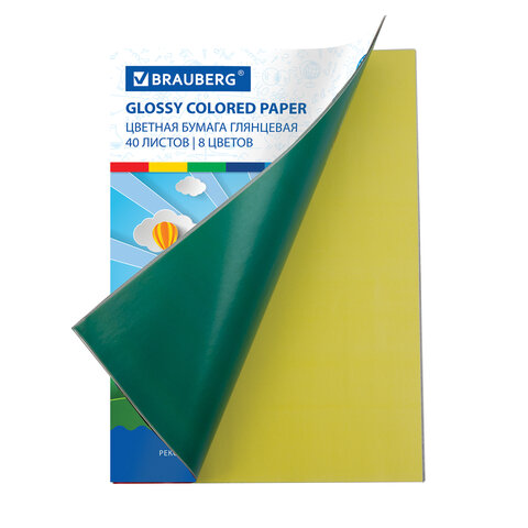 Цветная бумага А4 мелованная (глянцевая), 40 листов 8 цветов, на скобе, BRAUBERG, 200х280 мм, 128004