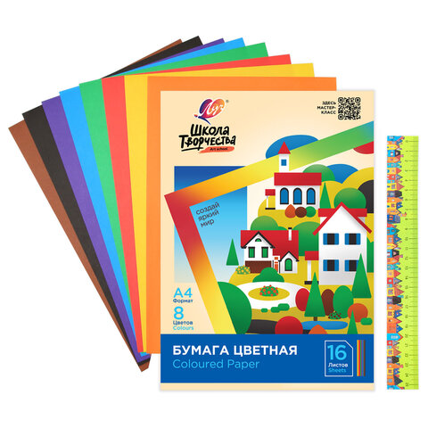 Цветная бумага А4 офсетная, 16 л., 8 цветов, в папке, ЛУЧ "Школа творчества", 210х297 мм, 30С 1790-08