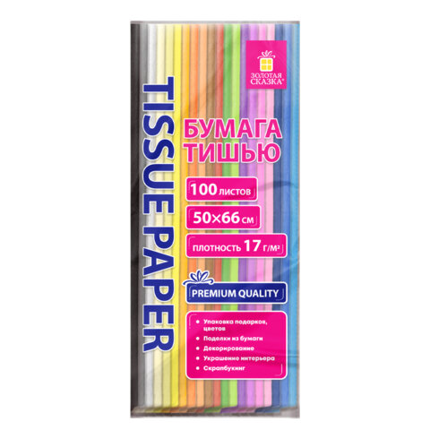 Цветная бумага ТИШЬЮ 17 г/м2, 50х66 см, 100 листов, 20 цветов, пастель ассорти, ЗОЛОТАЯ СКАЗКА, 116495