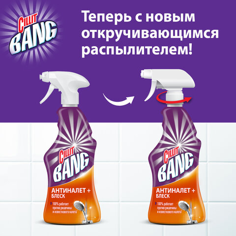 Чистящее средство CILLIT BANG "Антиналет + Блеск" эффективно удаляет известковый налет, мыльные разводы, ржавчину и глубоко въевшуюся грязь.