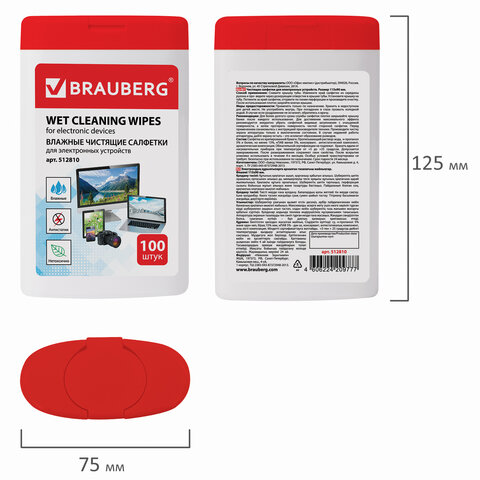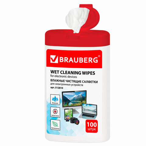 Салфетки для электронных устройств универсальные BRAUBERG, компактная туба 100 шт., влажные, 512810