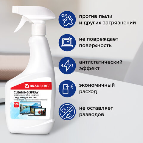 Высокоэффективное средство BRAUBERG для легкой и мягкой очистки всех типов экранов, оптических, стеклянных и пластиковых поверхностей бытовой и офисной техники от пыли, грязи и жирных пятен.
