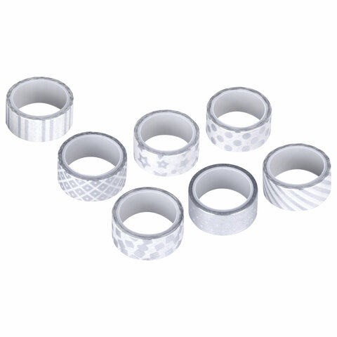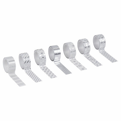 Клейкие WASHI-ленты для декора с фольгой СЕРЕБРИСТЫЕ, 15 мм х 3 м, 7 шт., рисовая бумага, ОСТРОВ СОКРОВИЩ, 661713