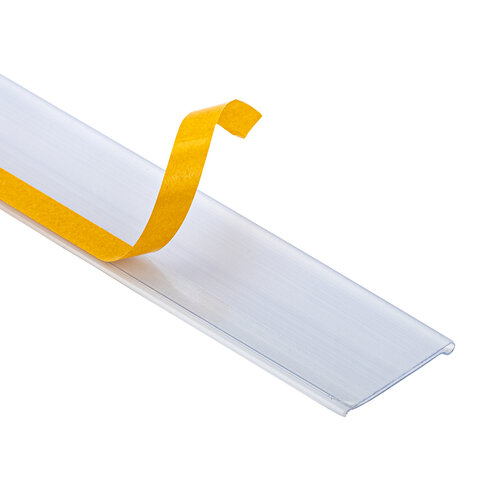 Самоклеящийся ценникодержатель DBR 39. Крепится на поверхность при помощи двустороннего прозрачного скотча, нанесенного на него.