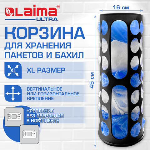 Корзина / диспенсер для хранения пакетов и бахил БОЛЬШАЯ 45х16х13 см, крючки-крепеж в комплекте, черная, LAIMA ULTRA, 701665