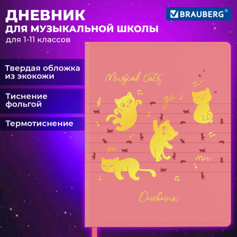 Дневник для музыкальной школы 170х215 мм, 48 л., обложка кожзам твердая, фольга, BRAUBERG, справочный материал, НОТКИ, 107368