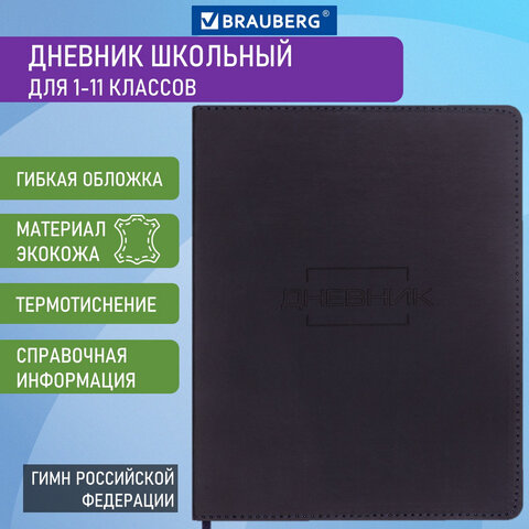 Дневник 1-11 класс 48 л., кожзам (гибкая), термотиснение, BRAUBERG "LATTE", черный, 105444