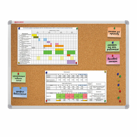 Пробковая доска BRAUBERG позволит разместить объявления при помощи кнопок и офисных булавок. Широко используется в организациях различного рода деятельности.