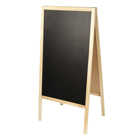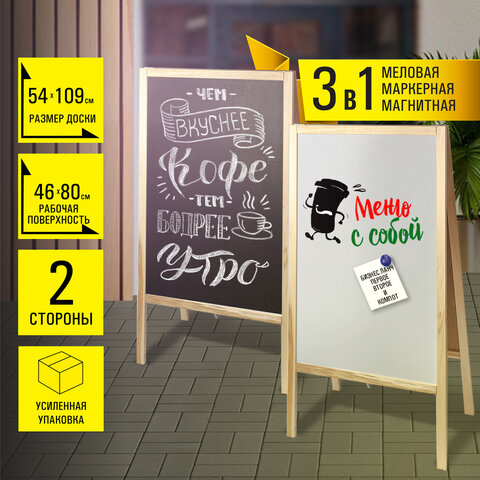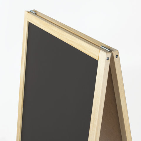 Доска-штендер STAFF для размещения рекламы и информации. Имеет 2 рабочие поверхности: черная из дерева - для письма мелом, белая металлическая - для письма специальными маркерами для белой доски и крепления объявлений с помощью магнитов.