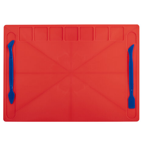 Доска для работы с пластилином имеет удобную, функциональную форму с углублениями для стеков и пластилина. Производится из специального пластика, к которому не липнет пластилин. Поставляется в нескольких вариантах цвета (без возможности выбора).