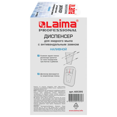 Дозатор для жидкого мыла LAIMA PROFESSIONAL подходит для использования в местах с любой проходимостью, таких как туалетная комната в ресторане, офисе, торговом центре,