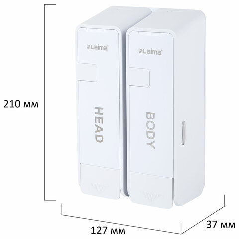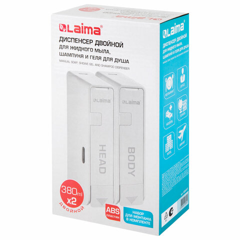 Дозатор для жидкого мыла/шампуня/геля LAIMA ULTRA двойной 2х0,38 л. Благодаря конструкции из двух дозаторов, максимально удобен для использования в душевых комнатах с шампунем и гелем. Подойдет и для стандартного применения с обычным жидким мылом.