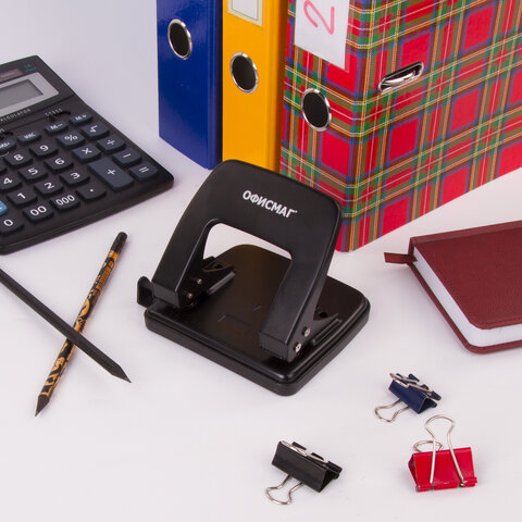 Дырокол металлический ОФИСМАГ – это необходимый офисный предмет, с помощью которого можно аккуратно пробивать отверстия в бумаге и затем подшивать документы в папку.