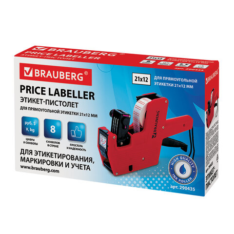 Этикет-пистолет однострочный, прямоугольная лента 21x12 мм, 8 символов, BRAUBERG, 290435