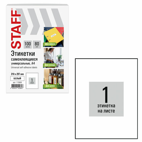 Этикетка самоклеящаяся 210х297 мм, 1 этикетка, белая, 80 г/м2, 100 листов, STAFF BASIC, 115668