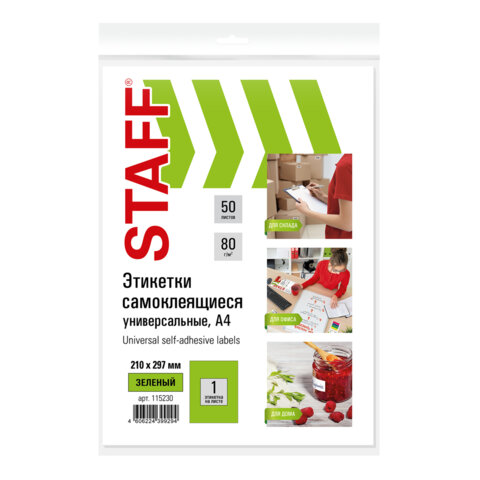 Этикетка самоклеящаяся 210х297 мм, 1 этикетка, зеленая, 80 г/м2, 50 листов, STAFF, 115230
