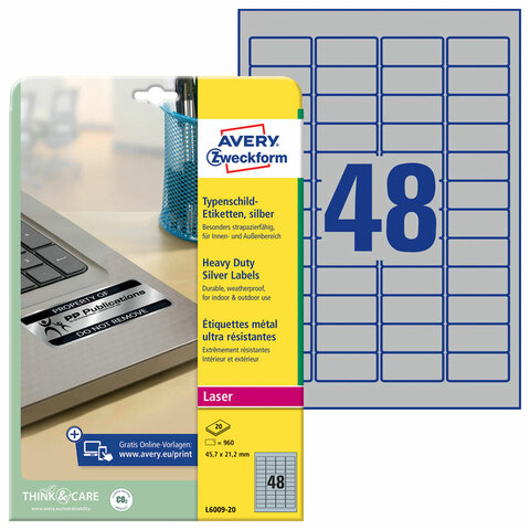 Этикетка самоклеящаяся 45,7х21,2 мм, 48 этикеток, полиэстер, серебро, 20 листов, Avery Zweckform, L6009-20