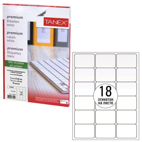 Этикетка самоклеящаяся 67х46 мм, 18 этикеток, белая, 70 г/м2, 50 листов, TANEX, сырье Финляндия, 114535, TW-2067