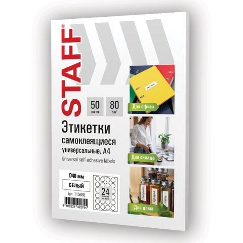 Этикетка самоклеящаяся D 40 мм, 24 этикетки, белая, 80 г/м2, 50 листов, STAFF BASIC, 115658