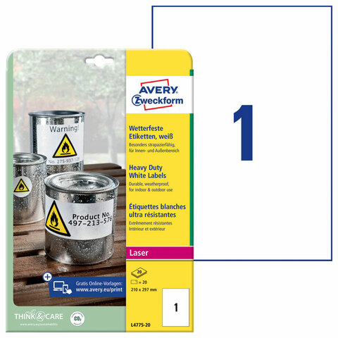 Этикетка самоклеящаяся ВСЕПОГОДНАЯ 210x297 мм, 1 этикетка, полиэстер, белая, 20 листов, Avery Zweckform, L4775-20