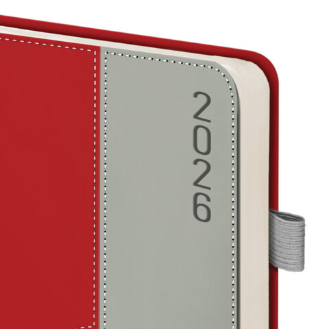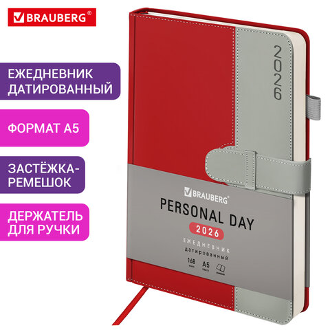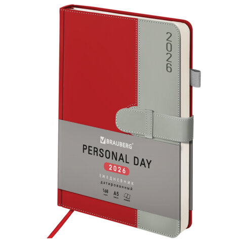 Ежедневник датированный 2026, А5, 138х213 мм, BRAUBERG "Esthetic", под кожу, держатель для ручки, застежка, красный/серый, 117371