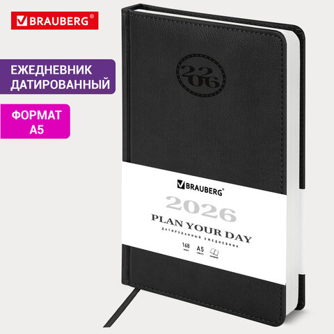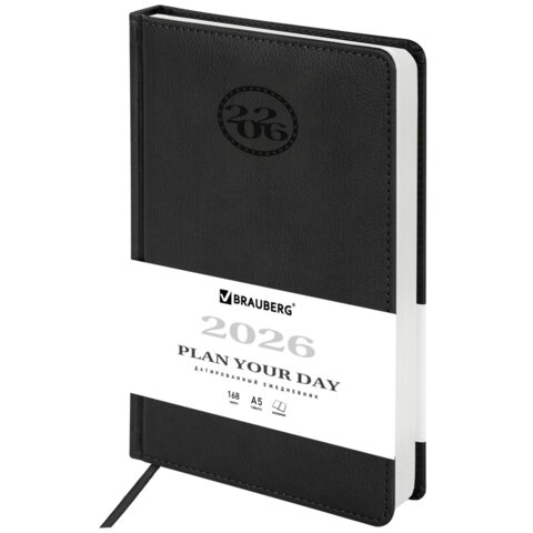 Ежедневник датированный 2026, А5, 138x213 мм, BRAUBERG "Favorite", под кожу, черный, 117037