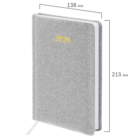 Ежедневник датированный 2026, А5, 138x213 мм, BRAUBERG "Sparkle", под кожу, блестки, серебристый, 117440