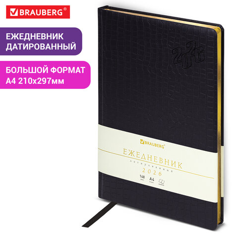 Ежедневник датированный 2026 БОЛЬШОЙ ФОРМАТ 210х297мм А4, BRAUBERG Comodo, под кожу, черный, 117242