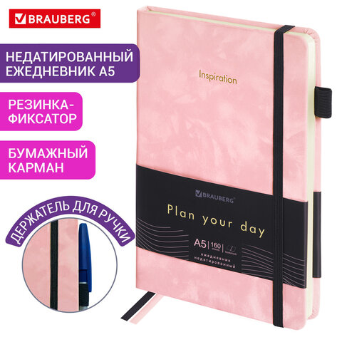 Ежедневник недатированный А5 138x213 мм, BRAUBERG "Velvet", резинка, держатель, 160 л., розовый, 116246