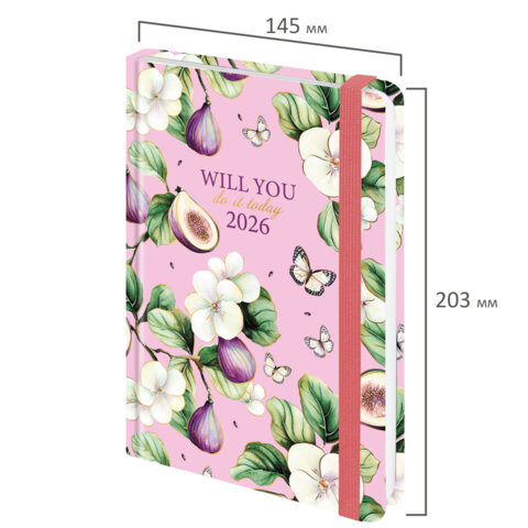 Ежедневник датированный 2026 с резинкой 145х203 мм, А5, BRAUBERG, твердый, фольга, "Инжир", 117337