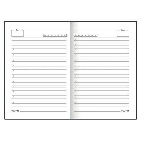 Недатированный ежедневник STAFF предназначен для ведения записей. Отсутствие дат делает его уникальным товаром, которым можно начать пользоваться в любое время года. Надежен и практичен в применении.