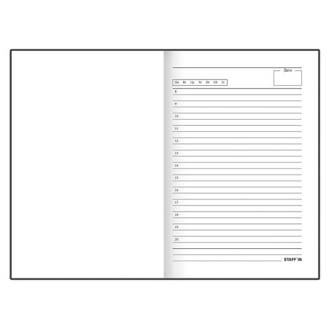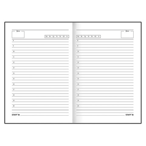 Недатированный ежедневник STAFF предназначен для ведения записей. Отсутствие дат делает его уникальным товаром, которым можно начать пользоваться в любое время года. Надежен и практичен в применении.