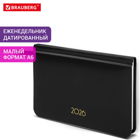 Еженедельник датированный 2026, МАЛЫЙ ФОРМАТ 95х155 мм, А6, BRAUBERG "Select", балакрон, черный, 117193