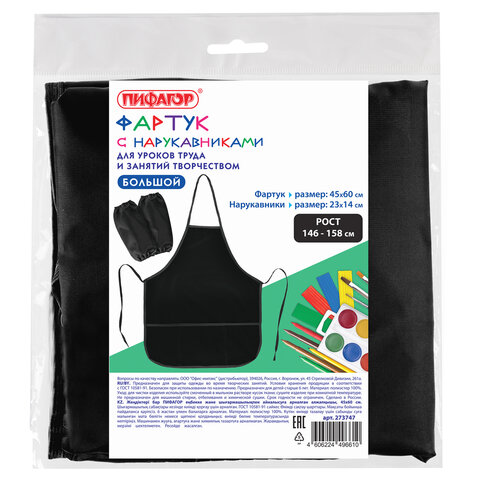 Фартук с нарукавниками для уроков труда ПИФАГОР, 3 кармана, увеличенный размер, 45x60 см, черный, 273747