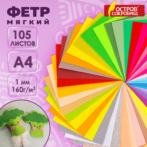 Фетр мягкий А4, 1 мм, 105 листов, 105 цветов, плотность 160 г/м2, МЯГКИЙ, ОСТРОВ СОКРОВИЩ, 665474