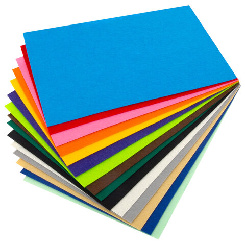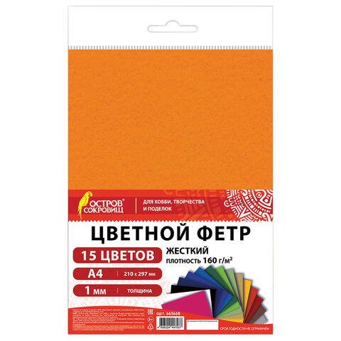 Фетр жесткий А4, 1 мм, 15 листов, 15 цветов, плотность 160 г/м2, ОСТРОВ СОКРОВИЩ, 665668