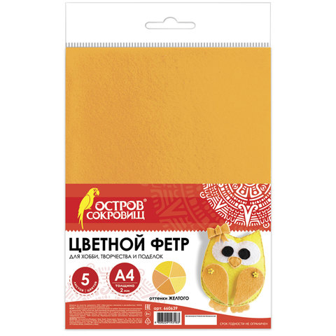 Цветной фетр МЯГКИЙ А4, 2 мм, 5 листов, 5 цветов, плотность 170 г/м2, оттенки желтого, ОСТРОВ СОКРОВИЩ, 660639