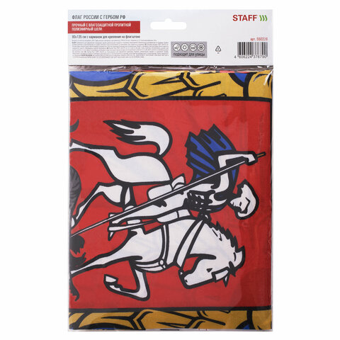 Флаг России 90х135 см с гербом, ПРОЧНЫЙ с влагозащитной пропиткой, полиэфирный шелк, STAFF, 550226