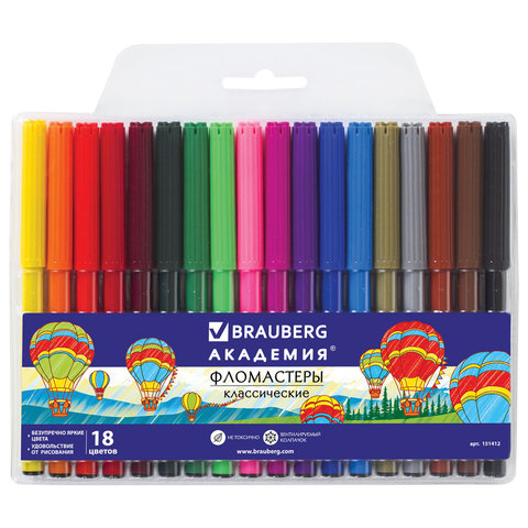 Фломастеры BRAUBERG "АКАДЕМИЯ", 18 цветов, вентилируемый колпачок, ПВХ упаковка, 151412