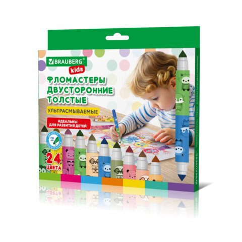 Фломастеры двусторонние толстые для малышей ультрасмываемые 12 штук / 24 цвета, BRAUBERG KIDS, 152626