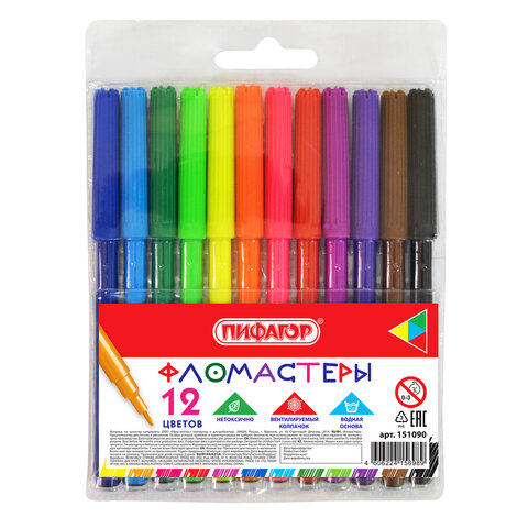 Фломастеры ПИФАГОР, 12 цветов, вентилируемый колпачок, 151090
