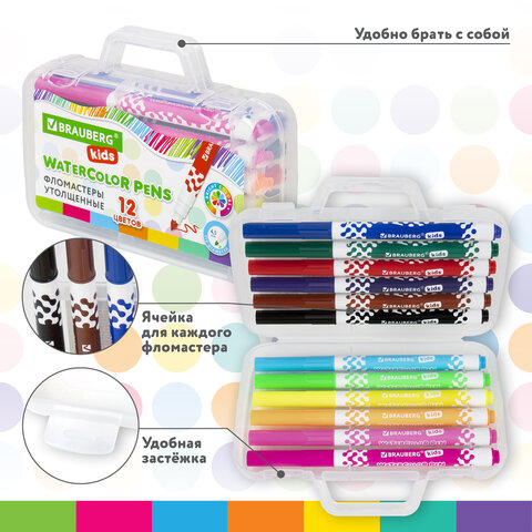 Фломастеры в портфельчике утолщенные 12 цветов, вентилируемый колпачок, BRAUBERG KIDS, 152185
