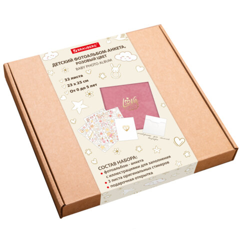 Фотоальбом-анкета детский 23х25 см, 32 листа, стикеры, открытка, конверт, розовый бархат, BRAUBERG, 391419
