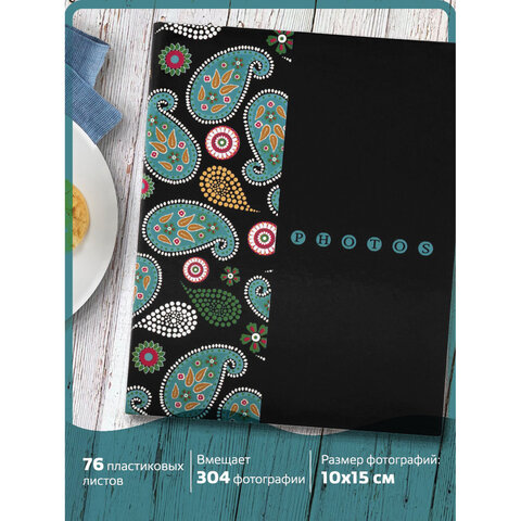Фотоальбом BRAUBERG на 304 фотографии 10х15 см, твердая обложка, "Пейсли", черный с бирюзовым, 390674