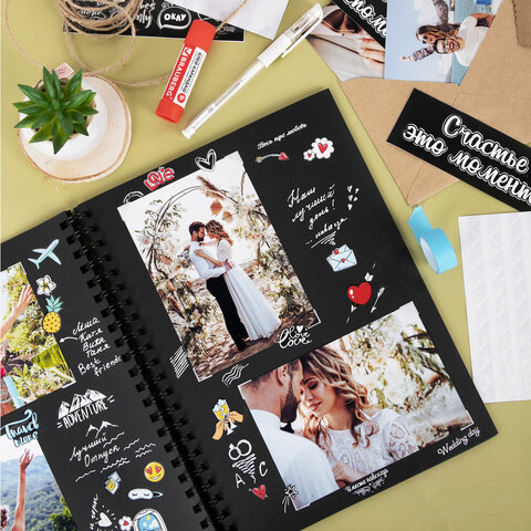 Фотоальбом "Счастье – это моменты" 24 чёрных листа 22x30, уголки, стикеры, ручка, клей, BRAUBERG, 391310