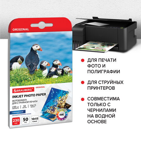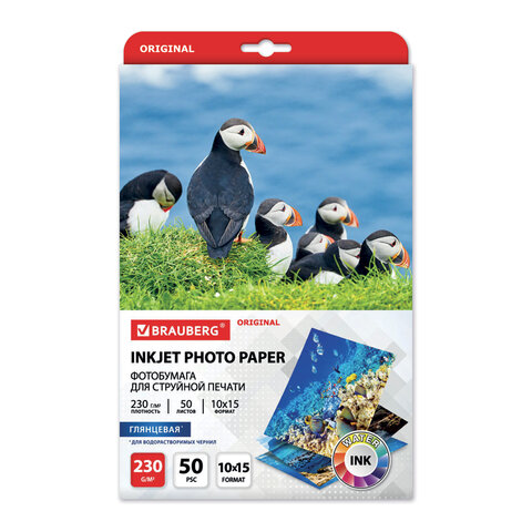 Фотобумага глянцевая, 10х15 см, 230 г/м2, односторонняя, 50 листов, BRAUBERG ORIGINAL, 363972