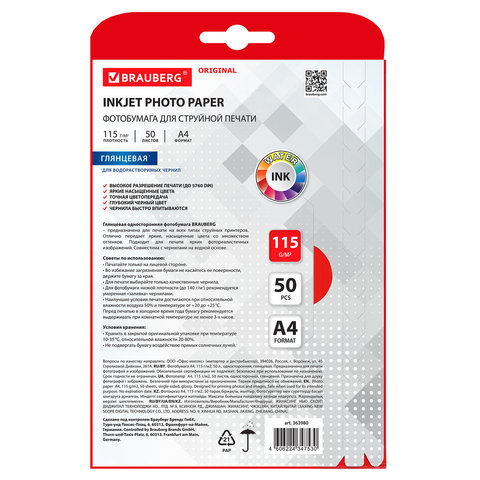 Фотобумага глянцевая, А4, 115 г/м2, односторонняя, 50 листов, BRAUBERG ORIGINAL, 363980