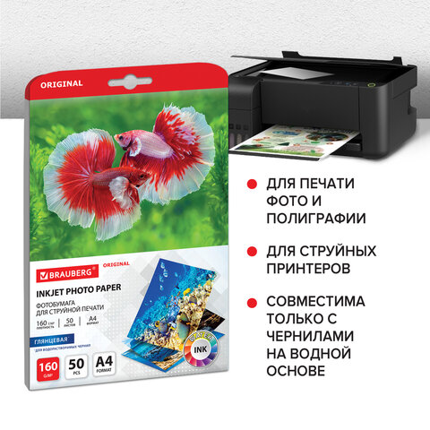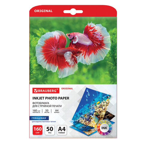 Фотобумага глянцевая, А4, 160 г/м2, односторонняя, 50 листов, BRAUBERG ORIGINAL, 363984